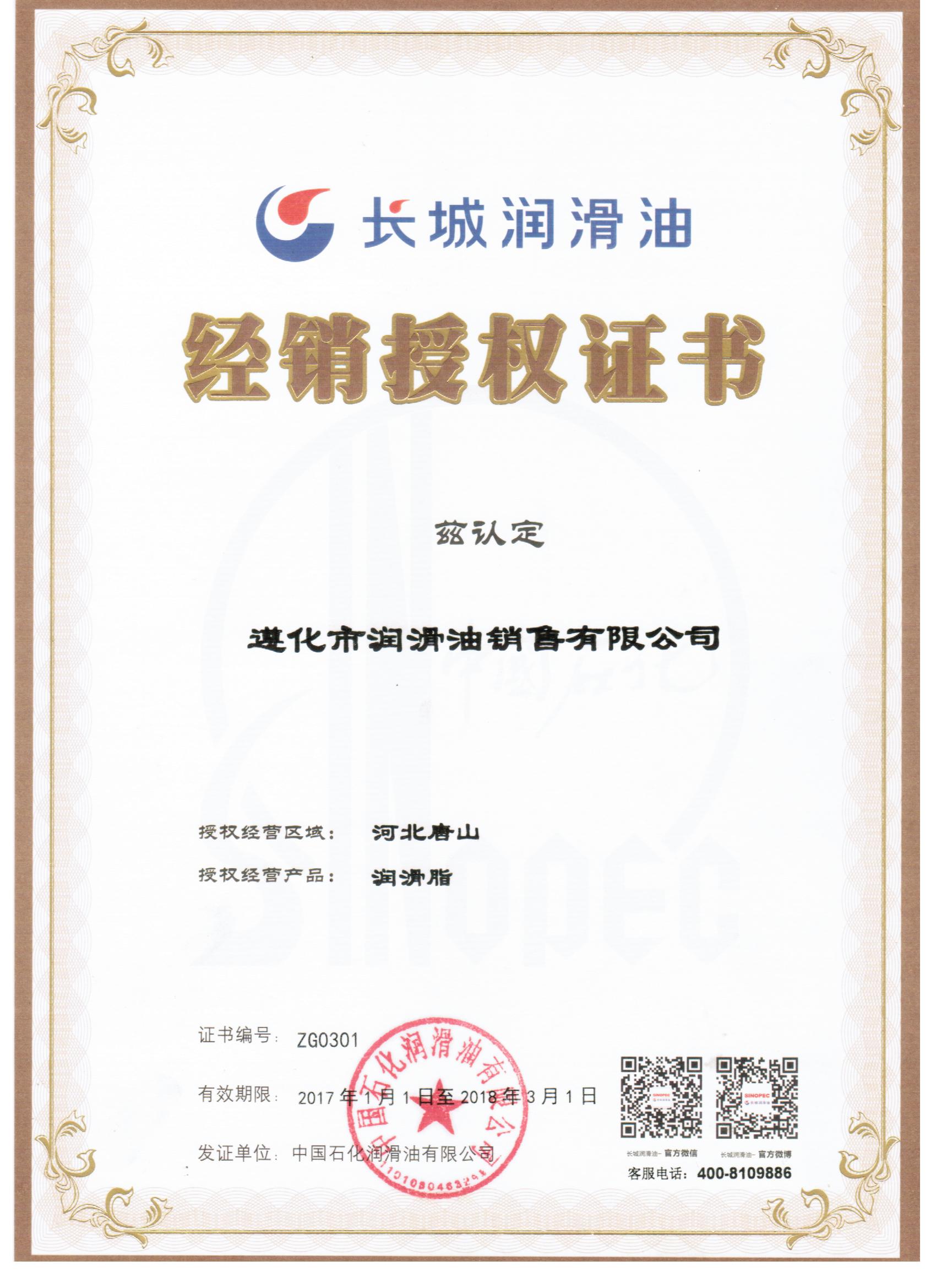 長城潤滑脂授權(quán)證書